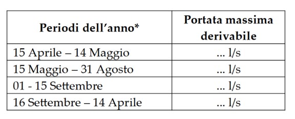 Di fianco (immagine espandibile) si propone un esempio di cartello i cui dati (periodi dell’anno e portata massima derivabile) andranno inseriti in base a quanto riportato nel disciplinare di concessione. Il cartello dovrà essere realizzato in modo idoneo a perdurare e rimanere leggibile nel tempo (incisione con verniciatura con caratteristiche di durabilità idonee al contesto) e dovrà essere posizionato nelle vicinanze dell’asta per permetterne la corretta lettura. I caratteri delle scritte del cartello dovranno essere di dimensioni tali da essere ben leggibili anche a distanza in funzione della configurazione e dell’accessibilità dei luoghi: a titolo di esempio un cartello posizionato sulla sponda di un canale dovrà essere ben leggibile anche dalla sponda opposta. I periodi dell’anno vanno chiaramente modificati in base alle indicazioni riportate nel disciplinare di concessione.
