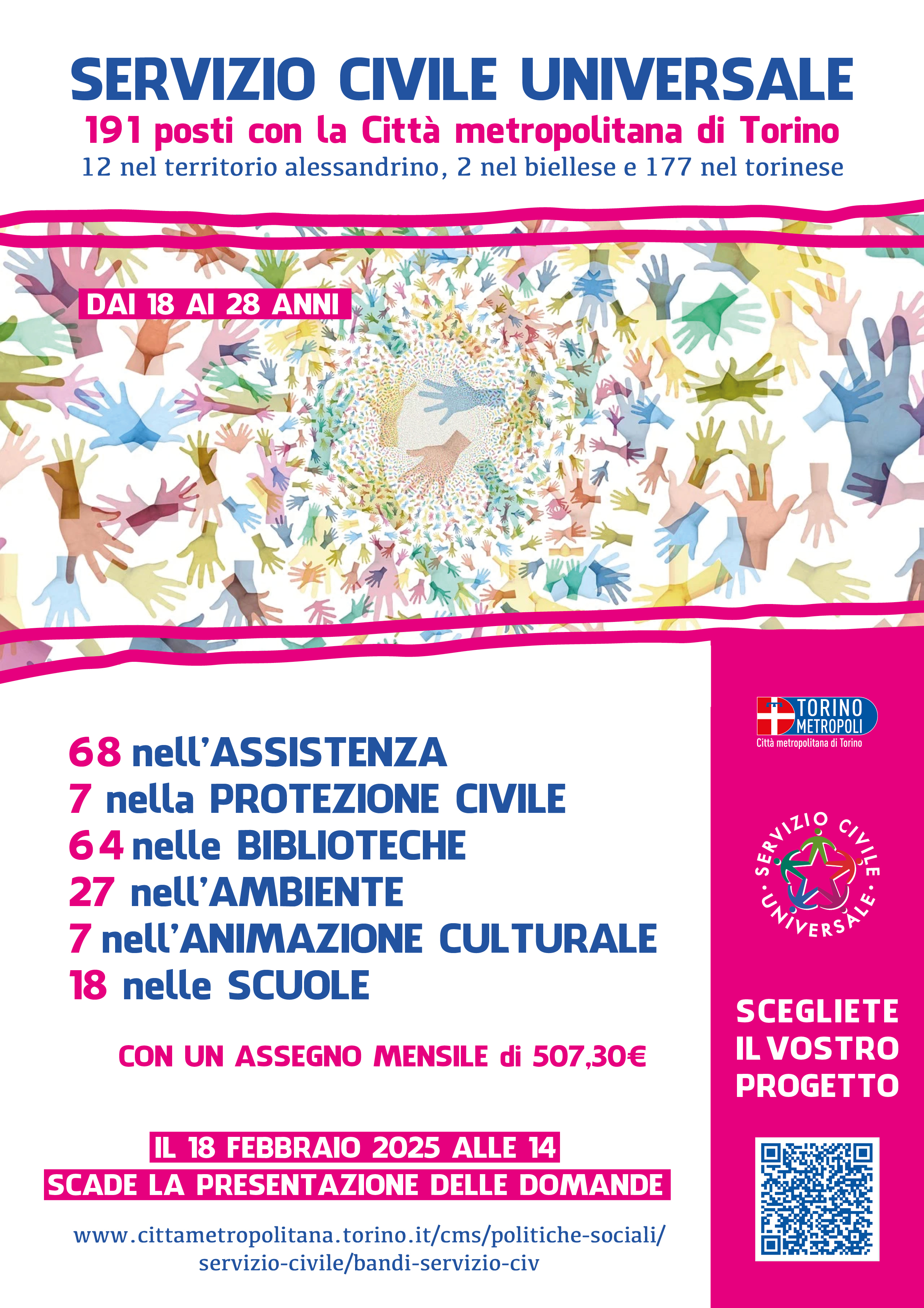 La Città metropolitana di Torino e gli Enti da essa accreditati cercano 191 giovani da inserire in progetti di Servizio Civile Universale, di cui 67 posti riservati ai giovani con Minori Opportunità con un ISEE (in corso di validità) di valore inferiore o pari a 15.000 euro.