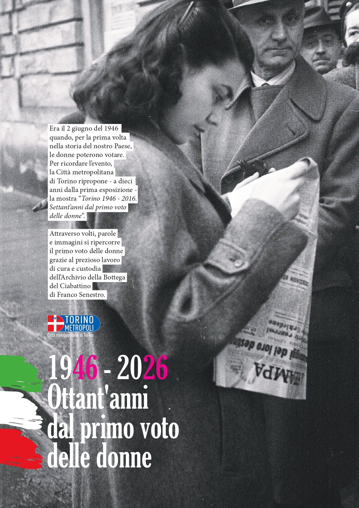 Parte con entusiasmo il tour itinerante di una nuova edizione della mostra fotografica "Torino 1946 - 2016. Settant'anni dal primo voto delle donne" che la Città metropolitana di Torino, dopo il successo di dieci anni fa, è tornata a mettere a disposizione del territorio con il titolo "Torino 1946 - 2026. Ottant'anni dal primo voto delle donne".