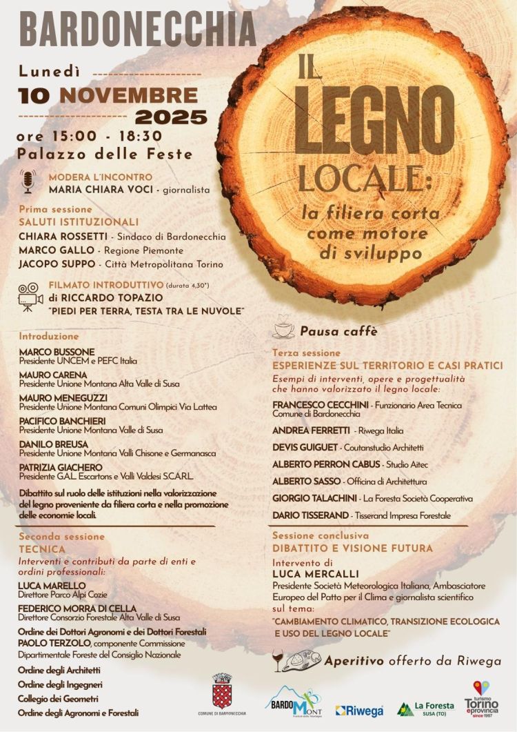 Si parlerà della filiera corta e locale del legno come motore di sviluppo nel convegno che il Comune di Bardonecchia ha organizzato per lunedì 10 novembre a partire dalle 15 al Palazzo delle Feste, con il patrocinio della Città metropolitana di Torino. I saluti istituzionali saranno portati dalla Sindaca di Bardonecchia, Chiara Rossetti, dal Vicesindaco metropolitano Jacopo Suppo, e dall’Assessore regionale alla Montagna, Marco Gallo. Del ruolo delle istituzioni nella valorizzazione della filiera del legno discuterà Marco Bussone, Presidente nazionale dell’UNCEM, insieme ai presidenti delle Unioni Montane Alta Valle di Susa, Comuni Olimpici Via Lattea, Valle di Susa, Valli Chisone e Germanasca, ovvero Mauro Carena, Mauro Meneguzzi, Pacifico Banchieri e Danilo Breusa. A portare l’esperienza e le proposte del GAL Escartons e Valli Valdesi sarà la Presidente Patrizia Giachero. Nella sessione tecnica del convegno sono previsti interventi del direttore del Parco Alpi Cozie, Luca Marello, del direttore del Consorzio Forestale Alta Valle Susa, Federico Morra Di Cella, e di Paolo Terzolo della Commissione dipartimentale Foreste del Consiglio nazionale dell’Ordine degli Agronomi e dei Dottori Forestali. Delle esperienze sul territorio e di alcuni casi di valorizzazione delle filiera forestale parleranno il funzionario del Comune di Bardonecchia Francesco Cecchini e alcuni professionisti che lavorano per ditte del settore e per studi di consulenza tecnica. A tirare le conclusioni del dibattito sarà Luca Mercalli, Presidente della Società Meteorologica Italiana e ambasciatore europeo del Patto per il Clima.