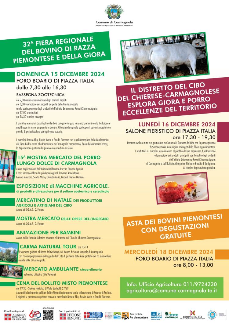Lunedì 16 dicembre dalle 17,30 alle 19,30 nel salone fieristico di viale Garibaldi è in programma l’evento “Il Distretto del Cibo del Chierese-Carmagnolese esplora Giora e Porro, eccellenze del territorio”, con la partecipazione di Simona Riccio, digital strategist della filiera agroalimentare. I produttori agricoli e i macellai carmagnolesi racconteranno al pubblico le loro esperienze di coltivazione e lavorazione dei prodotti principali. Al termine verrà offerta una degustazione gratuita. Mercoledì 18 dicembre dalle 8 alle 13 al foro boario di piazza Italia è invece in programma l’Asta dei bovini di razza piemontese e bovini da ingrasso di qualsiasi età, accompagnata da degustazioni gratuite.