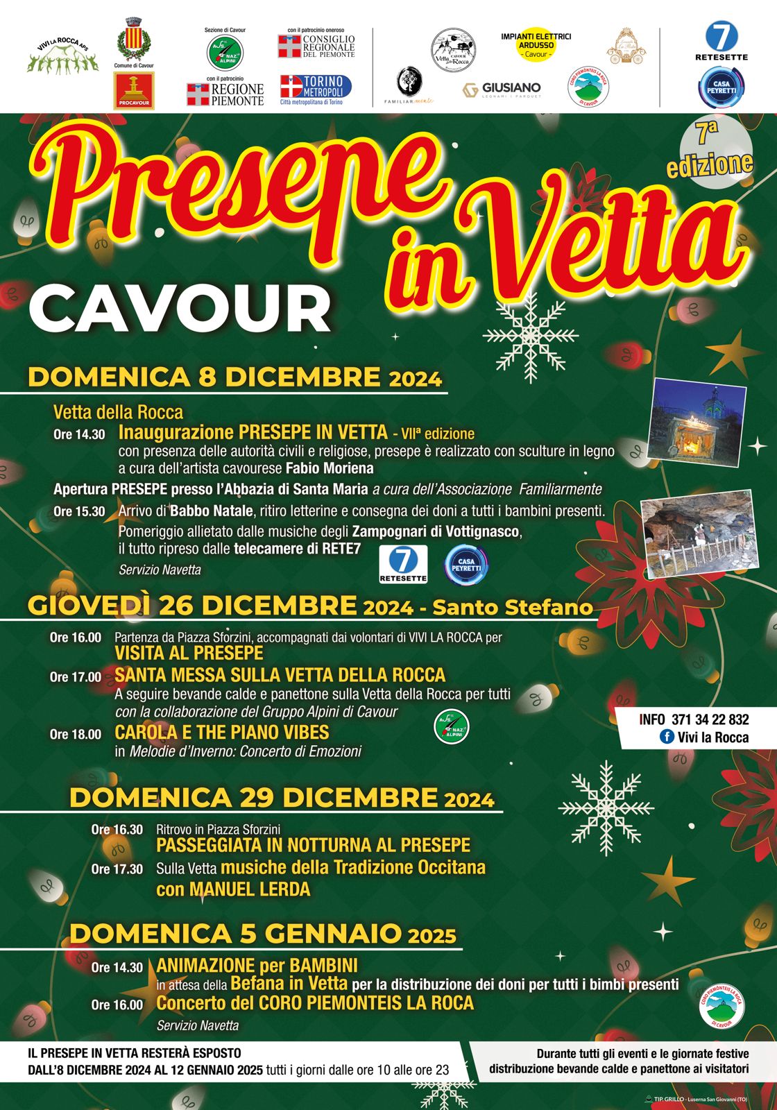 A Cavour, grazie all’impegno dei volontari dell’Associazione Vivi la Rocca, si rinnova, anche quest’anno, la tradizione del suggestivo Presepe in Vetta, la settima edizione di uno dei più spettacolari e scenografici presepi del pinerolese.