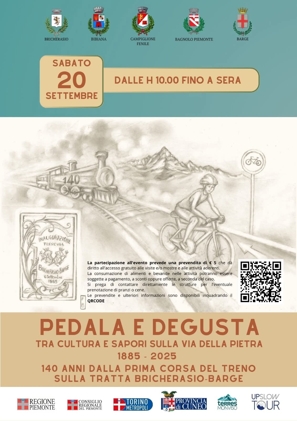 Oggi l’ex sedime della ferrovia dismessa ospita un’apprezzata pista ciclabile, completata nell’autunno del 2023 dalla Città metropolitana di Torino, che ha lavorato al progetto di valorizzazione del turismo ciclabile in sinergia con la Provincia di Cuneo. Alle celebrazioni in corso a Barge sabato 20 settembre si affiancherà l’iniziativa “Pedala e degusta”, che collegherà i Comuni attraversati dalla pista ciclabile denominata Via della Pietra. La partecipazione all'evento in bicicletta, patrocinato dalla Città metropolitana di Torino, ha un costo di 5 euro. La consumazione di alimenti e bevande negli stand delle attività agricole poste lungo il percorso potrà essere a pagamento o ad offerta libera. L'obiettivo dell'iniziativa è la promozione del territorio. Si potrà pedalare dalle 10 del mattino fino a sera e non è previsto un punto preciso per la partenza: l'importante è immettersi sulla ciclabile a Barge, a Bagnolo, a Bibiana, a Campiglione o a Bricherasio e pedalare. Sempre sabato 20 settembre, anche a Bagnolo sarà inaugurata una mostra fotografica dedicata al treno, negli spazi rinnovati della ex stazione ferroviaria. In serata alle 21 è in programma lo spettacolo del Teatro a Pedali intitolato “Margherito - C'è tempo per tornare a casa", con ingresso libero.