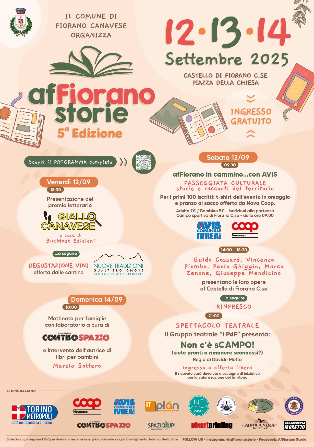 Il programma prevede venerdì 12 settembre la presentazione del Premio letterario Giallo Canavese, il primo premio letterario per racconti gialli dedicato a questo territorio; sabato 13 settembre alle 9,30 attività ludico motoria e culturale al campo sportivo e afFIORANO in cammino con Avis, passeggiata di 4 km per le vie e i sentieri di Fiorano Canavese; alle 14 Guido Cossard presenta il libro scritto insieme a Alberto Cora “Come in cielo così in terra”; alle 15 Vincenzo Piombo racconta “Non tutti nella capitale”; alle 16 Paolo Ghiggio illustra “Quando Alfonsina faceva la sartina”; alle 17 Marco Zenone presenta “Visite e altri incontri di apparente marginalità”; alle 18 Giuseppe Mendicino dialoga con Sonia Giacoma Ghello partendo dal suo libro “Mario Rigoni Stern - Un ritratto”. Nella giornata di domenica 14 settembre si svolge il laboratorio esperienziale “Un rifugio dentro di me” a cura di Studio Sigrè e Associazione Contro Spazio e, per finire, alle 11 un incontro con Marzia Sottero, illustratrice per bambini.