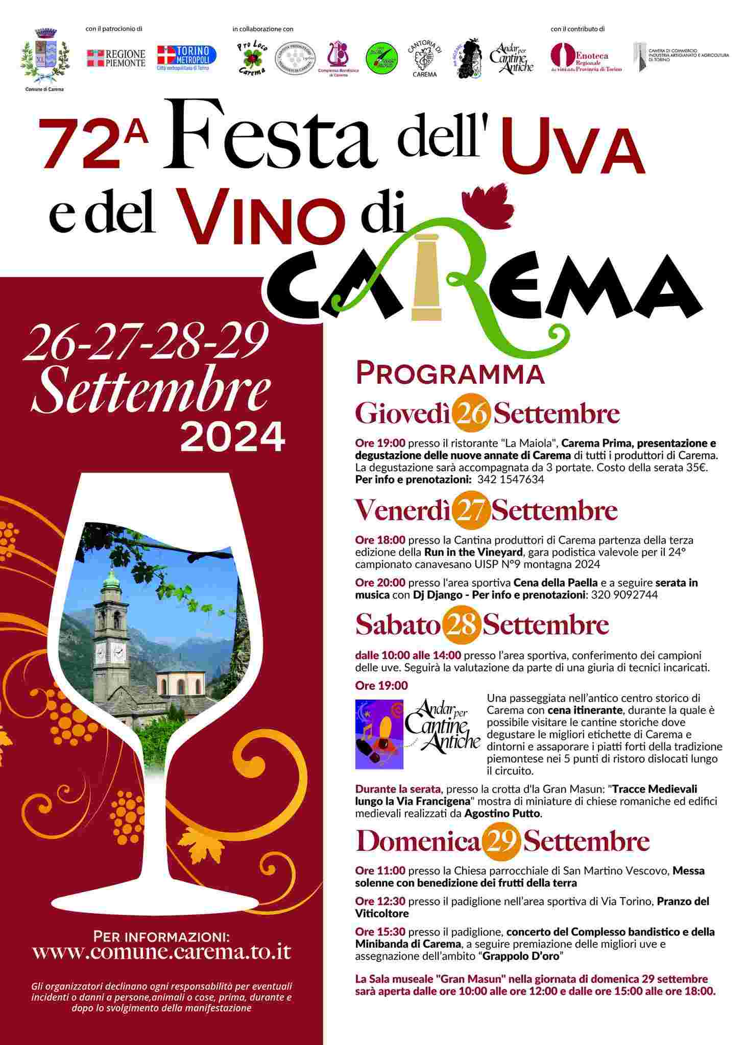 Da giovedì 26 a domenica 29 settembre tornala Festa dell’Uva e del Vino di Carema, che promuove l’immagine della vitivinicoltura eroica del Canavese. La settantaduesima edizione dell’evento, organizzato dal Comune in collaborazione con le associazioni locali e con la Cantina produttori Nebbiolo di Carema, è patrocinata dalla Città metropolitana di Torino ed inizia giovedì 26 alle 19 con la serata “Carema Prima” che propone una presentazione e degustazione delle nuove annate dei produttori locali al ristorante La Maiola. Per informazioni e prenotazioni si può chiamare il numero telefonico 342-1547634. Venerdì 27 spazio agli sportivi con la corsa Run in the Vineyard, valevole per la classifica del Campionato Canavesano UISP. Alle 20 nel padiglione dell’area sportiva è in programma la Cena della Paella, prenotabile al numero 320-9092744. A seguire la serata in musica con il dj Django. Il sabato dalle 10 alle 14 i produttori possono conferire i campioni delle uve che intendono candidare al premio Grappolo d’Oro, mentre la serata è dedicata alla cena itinerante “Andar per Cantine Antiche”. Durante la serata nella cantina della casaforte-museo Gran Masun è possibile visitare la mostra “Tracce Medioevali lungo la Via Francigena”, dedicata a miniature provenienti da chiese romaniche e altri edifici, curata da Agostino Putto. L’esposizione museale alla Gran Masun è visitabile domenica 29 dalle 10 alle 12 e dalle 15 alle 18. La giornata festiva inizia con la Messa solenne e la benedizione dei frutti della terra e prosegue con il Pranzo del Viticoltore nell’area sportiva di via Torino. Nel pomeriggio a partire dalle 15,30 si possono ascoltare le note del Complesso bandistico e della minibanda di Carema. La giornata di festa si chiude con la premiazione delle uve con l’ambito Grappolo d’Oro e con altri riconoscimenti.