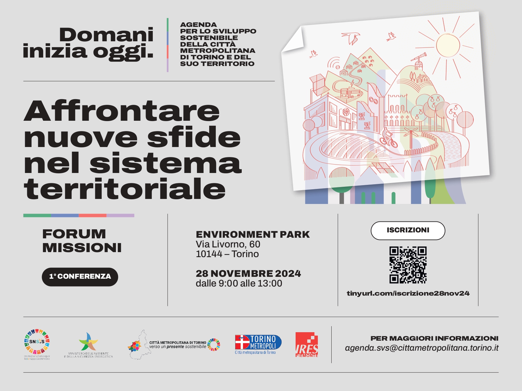 Nel pomeriggio della stessa giornata gli attori a scala regionale saranno chiamati a partecipare all'incontro di presentazione del Patto per lo sviluppo sostenibile del Piemonte, al cui interno il Forum Missioni di Città metropolitana sarà fondamentale per una visione completa della strategia regionale