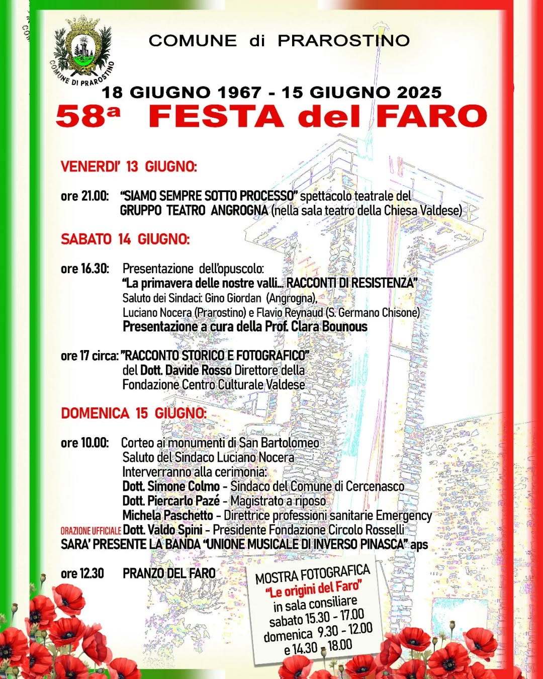 Le iniziative, patrocinate e sostenute dalla Città metropolitana di Torino nell’ambito del bando per le celebrazioni dell’80° anniversario della Liberazione, iniziano venerdì 13 giugno nella sala della chiesa valdese con lo spettacolo del Gruppo Teatro Angrogna “Siamo sempre sotto processo”. Sabato 14 alle 15,30 nella sala consiliare del Municipio si inaugura la mostra fotografica “Le origini del Faro”, visitabile sino alle 17 e ancora domenica 15 dalle 9,30 alle 12 e dalle 14,30 alle 18. Sabato 14 alle 16,30 la professoressa Clara Bounous presenta l’opuscolo “La primavera delle nostre valli… racconti di Resistenza”. Intervengono i Sindaci di Angrogna, Gino Giordan, di Prarostino, Luciano Nocera, e di San Germano Chisone, Flavio Reynaud. A seguire il racconto storico e fotografico a cura di Davide Rosso, direttore della Fondazione Centro Culturale Valdese. Le celebrazioni di domenica 15 giugno iniziano alle 10 con il ritrovo dei partecipanti sul piazzale del Municipio, da dove prende le mosse il corteo verso i monumenti di San Bartolomeo. Oltre al sindaco Luciano Nocera, intervengono il primo cittadino di Cercenasco, Simone Colmo, il magistrato a riposo Piercarlo Pazèe la direttrice delle professioni sanitarie di Emergency, Michela Paschetto. L’orazione ufficiale è affidata al presidente della Fondazione Circolo Rosselli, Valdo Spini. La mattinata si conclude con il Pranzo del Faro.