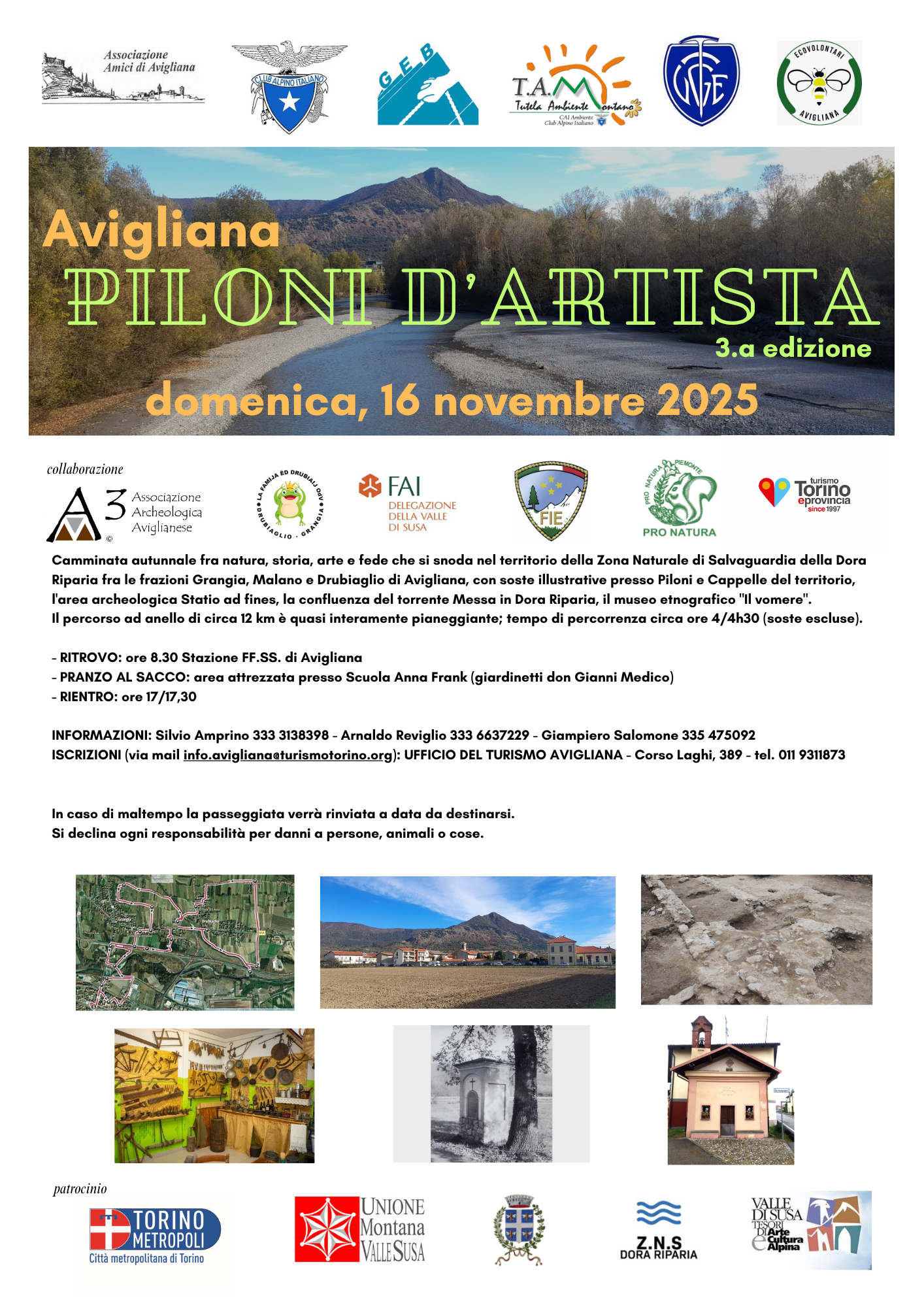 Tutti coloro che amano le camminate che uniscono la bellezza della natura con la scoperta di storia e tradizioni non possono mancare domenica 16 novembre alla 3ª edizione di "Piloni d’artista”, la camminata autunnale fra natura, storia, arte e fede che si snoda nel territorio della Zona naturale di salvaguardia della Dora Riparia nelle frazioni Grangia, Malano e Drubiaglio di Avigliana.