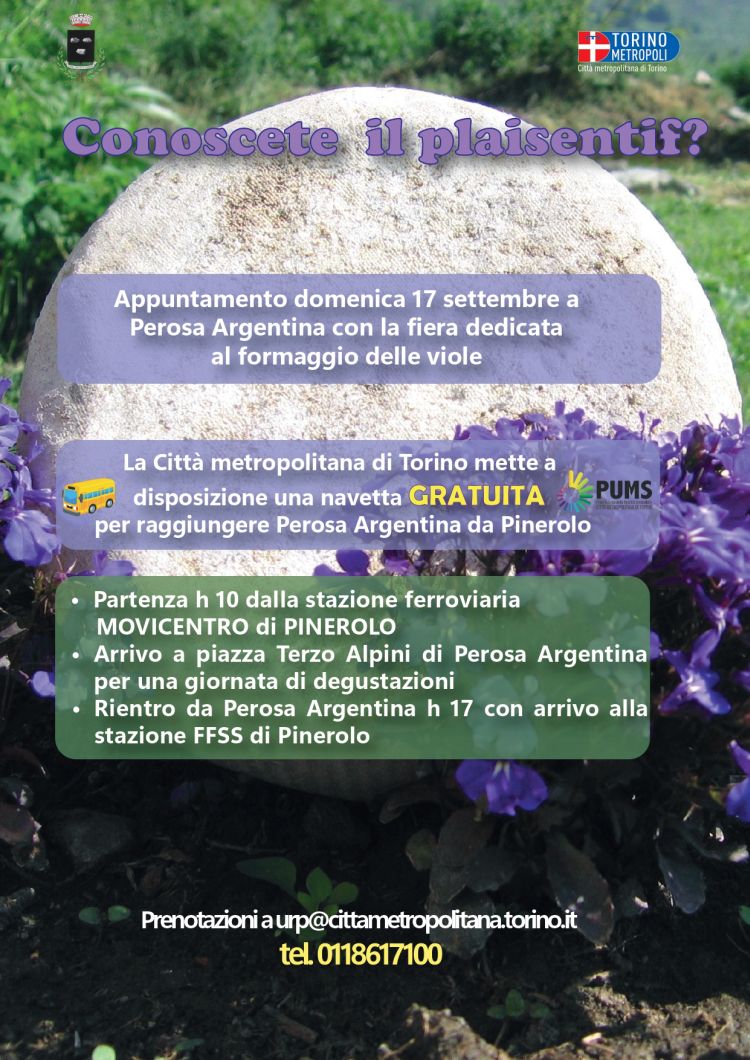 La protagonista del fine settimana è però la Fiera del Plaisentif di domenica 17 settembre, dedicata al “Formaggio delle viole”, la toma della Val Chisone prodotta da cinque secoli, riscoperta e valorizzata dal Comune di Perosa Argentina in collaborazione con gli Enti del territorio e con l'associazione dei quattordici produttori. Quest’anno, nell’ambito del PUMS, il Piano Urbano per la Mobilità Sostenibile, è disponibile un servizio gratuito di bus navetta con partenza alle 10 di domenica 17 dal Movicentro della stazione ferroviaria di Pinerolo e arrivo in piazza Terzo Alpini a Perosa. Il rientro è previsto con arrivo alle 17 a Pinerolo. Per la prenotazione si può scrivere a urp@cittametropolitana.torino.it o chiamare il numero telefonico 011-8617100.