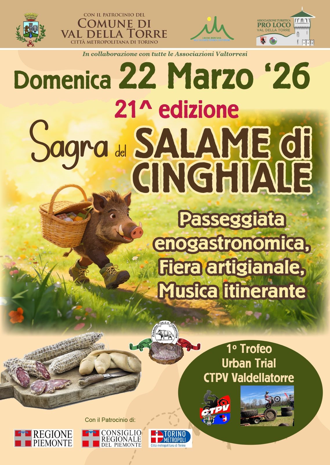 Comprende anche la passeggiata enogastronomica di 5 km “Cinghialando” il programma della ventunesima edizione della Sagra del Salame di Cinghiale, in programma domenica 22 marzo a Val della Torre, con il patrocinio della Città metropolitana di Torino. Il Salame Valtorrese di Cinghiale ha ottenuto la Denominazione Comunale d'Origine con delibera del Consiglio comunale del 30 settembre 2011 ed è inserito nell’elenco dei prodotti tipici dell’Unione Montana Valli di Lanzo, Ceronda e Casternone. La manifestazione è in programma nel parco Cravanzola e proporrà l’esposizione dei prodotti del territorio enogastronomici, artigianali e artistici. Oltre a visitare la fiera con i prodotti tipici locali nel Parco Cravanzola, si potrà pranzare con polenta e cinghiale o con un tagliere di salumi e formaggi al Centro di accoglienza turistica. È gradita la prenotazione al numero telefonico 335-8407913. Per l’intrattenimento musicale è stata scelta la Tequila Band. Nel Parco Cravanzola tra le 8,30 e le 16 è anche in programma la prima edizione del Trofeo Urban Trial CTPV Valdellatorre.
