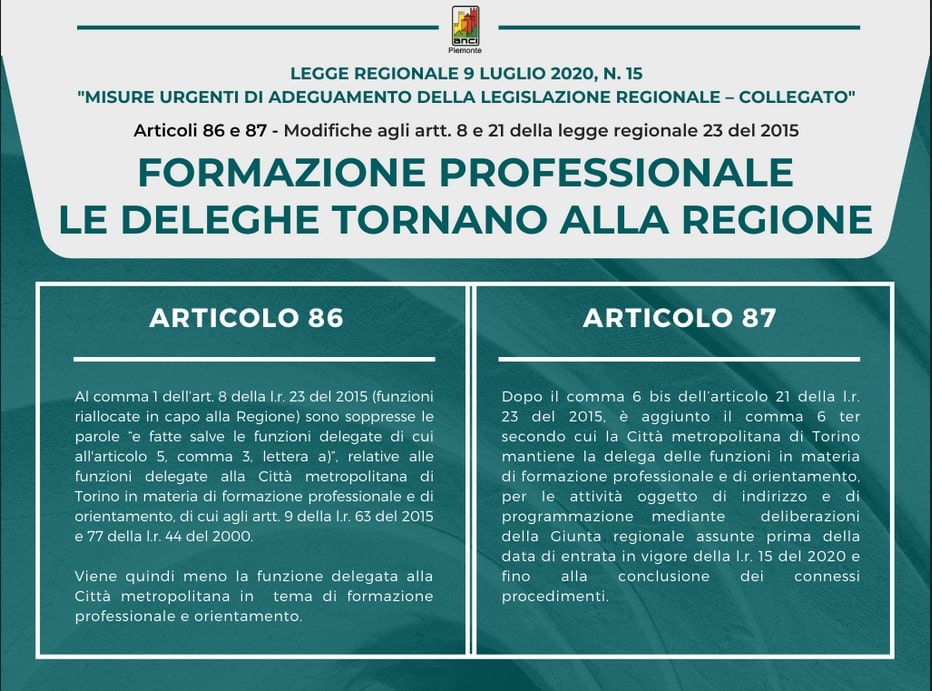 La Regione Piemonte ha deciso la soppressione delle deleghe esercitate da Città Metropolitana in materia di formazione professionale e di orientamento scolastico: una decisione avvenuta senza il necessario approfondimento, che penalizza una gestione consolidata nel tempo e che sta creando molta preoccupazione.