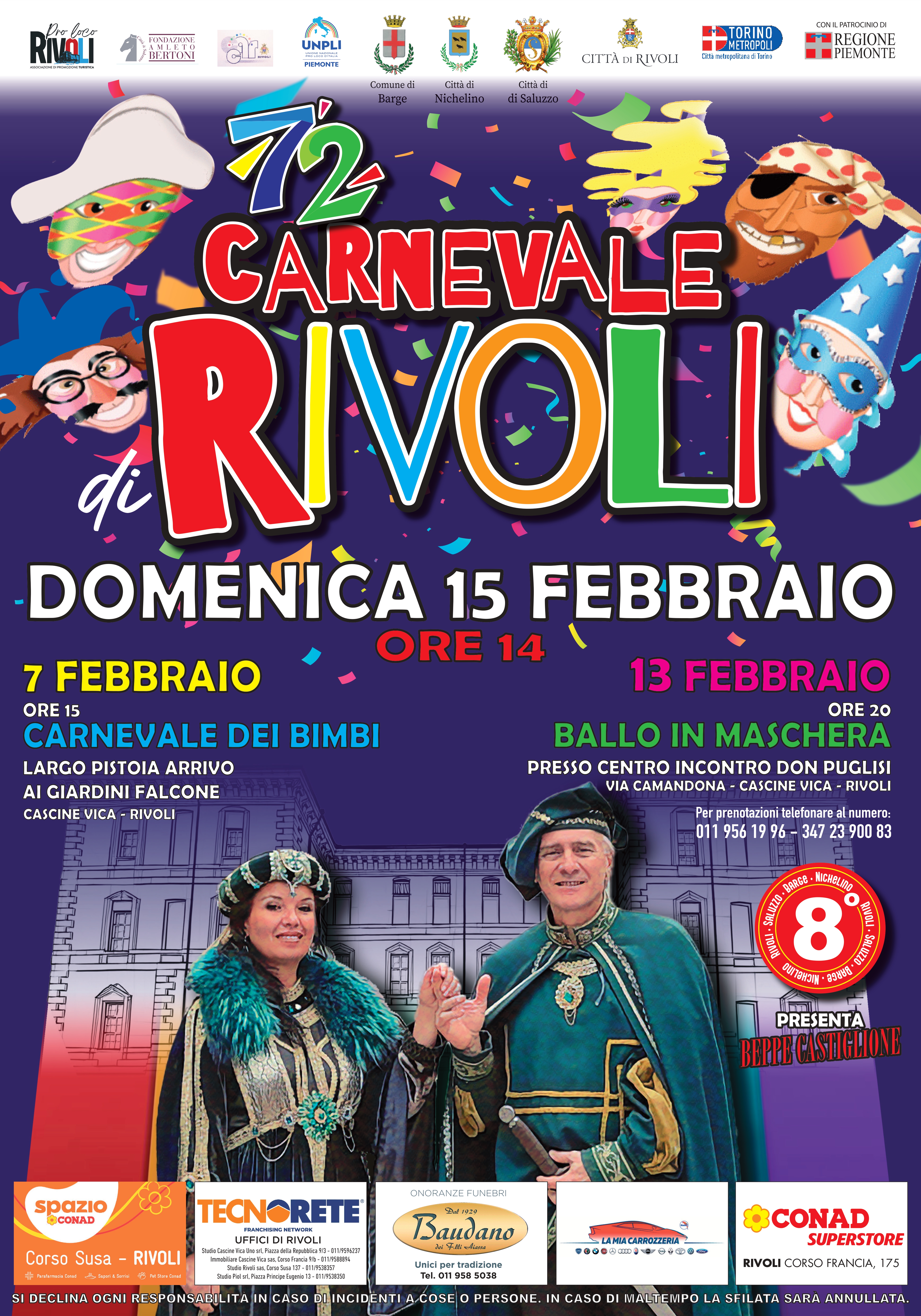 Torna il 72° Carnevale di Rivoli, uno degli appuntamenti più attesi e sentiti dell'anno, promosso dalla Pro Loco in collaborazione con la Città di Rivoli. Con la suggestiva cerimonia di investitura del Conte Verde e la consegna delle chiavi da parte del sindaco Alessandro Errigo, avvenuta domenica 25 gennaio, l’edizione 2026 del Carnevale è ufficialmente partita. Al centro della scena domina la figura di Amedeo VI di Savoia, il celebre "Conte Verde". La maschera rivolese non è un semplice travestimento, ma un tributo al nobile sabaudo che nel XIV secolo scelse proprio questo colore per un torneo, legando indissolubilmente il suo nome alla storia locale. Oggi, quel mito rivive attraverso il Gruppo Storico, impegnato a portare le radici medievali della città tra i banchi di scuola e nei quartieri.Dopo il successo del debutto, il programma entra ora nel cuore dei festeggiamenti con appuntamenti pensati per ogni fascia d’età. Si inizia sabato 7 febbraio a Cascine Vica con il Carnevale dei bambini, si prosegue venerdì 13 febbraio con il Ballo in maschera nel centro d’incontro Don Puglisi di via Camandona e si conclude domenica 15 febbraio con la Grande sfilata dei carri allegorici: un’esplosione di musica con bande e Majorette che attraverserà il centro storico. Prosegue anche quest’anno la prestigiosa sinergia con la Fondazione Amleto Bertoni di Saluzzo per il "Carnevale delle Due Province": un'alleanza che porterà a Rivoli cinque mastodontici carri allegorici in concorso, garantendo una risonanza mediatica regionale.