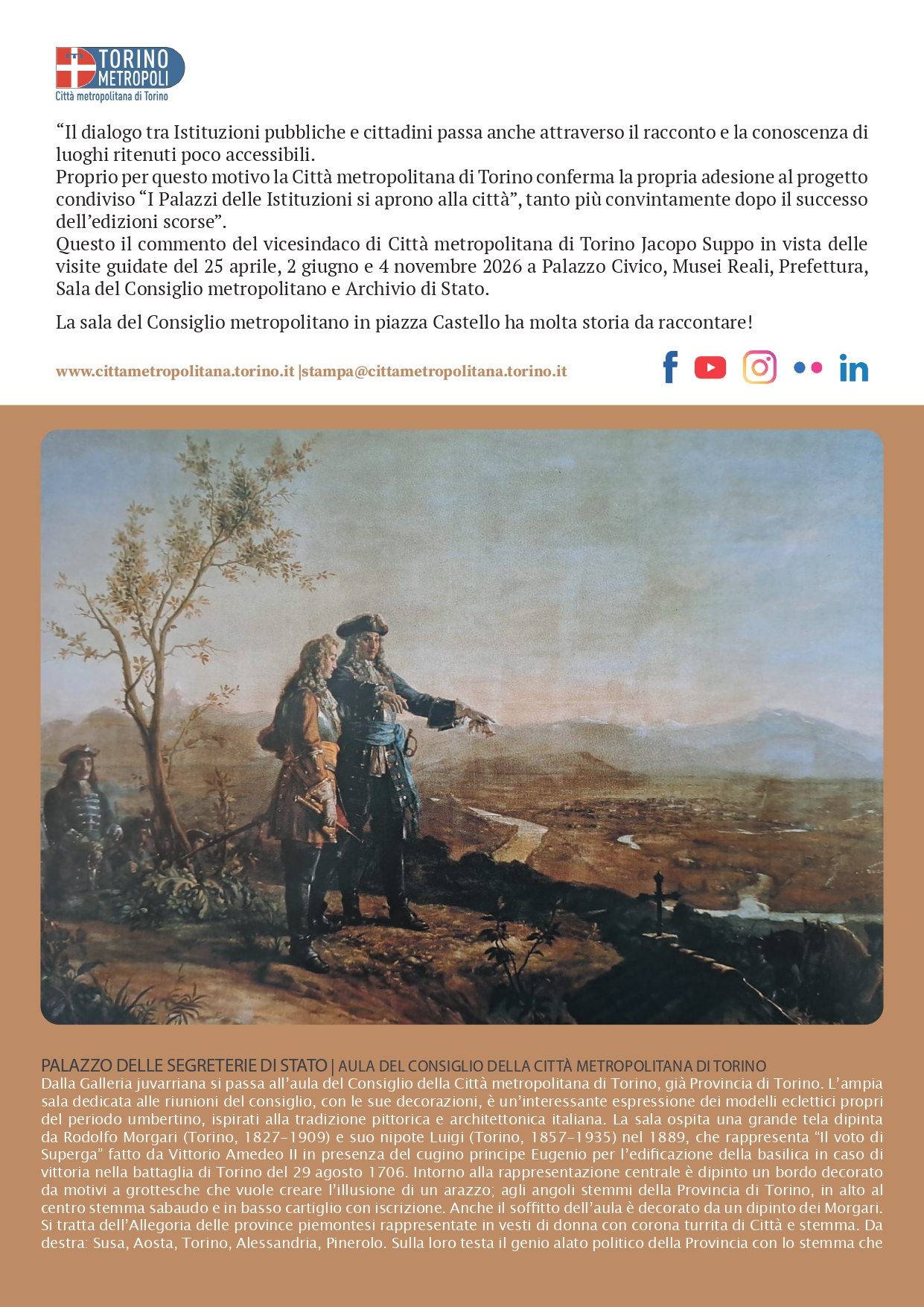 In occasione di tre ricorrenze dal profondo valore civico, il 25 aprile (anniversario della Liberazione), il 2 giugno (festa della Repubblica italiana) e il 4 novembre (giornata dell’Unità Nazionale e delle Forze Armate), sei istituzioni pubbliche che hanno sede in edifici storici torinesi aprono le loro porte per offrire un percorso insolito, nel cuore della città.