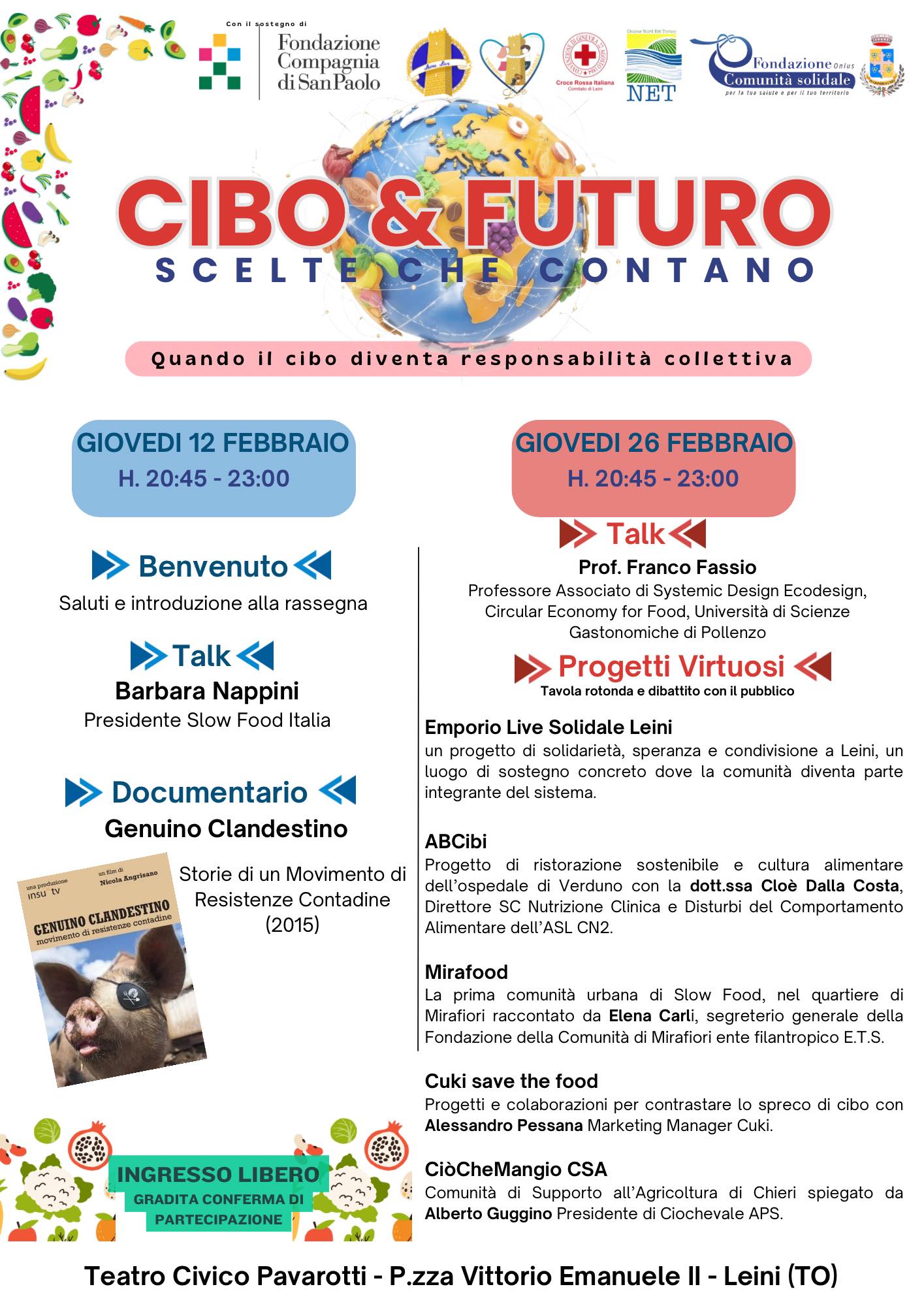 Il cibo non è solo nutrimento: è terra, lavoro, dignità, ambiente, comunità. Parte da questa considerazione l’iniziativa “Cibo & Futuro - Scelte che contano” dell’associazione Leini Live, che nei giovedì 12 e 26 febbraio propone due serate di informazione e sensibilizzazione a ingresso libero al teatro civico Pavarotti di piazza Vittorio Emanuele, con il patrocinio della Città metropolitana di Torino.