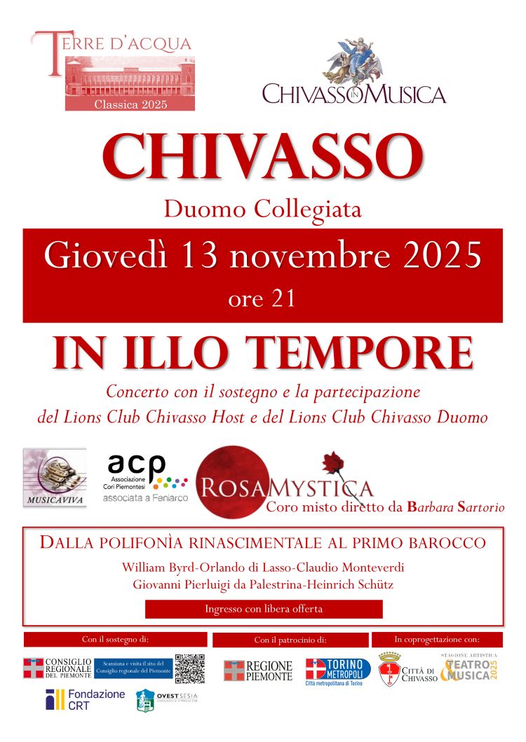 L’ingresso è ad offerta libera ed il concerto è organizzato con il sostegno dei Lions Club Chivasso Host e Chivasso Duomo.