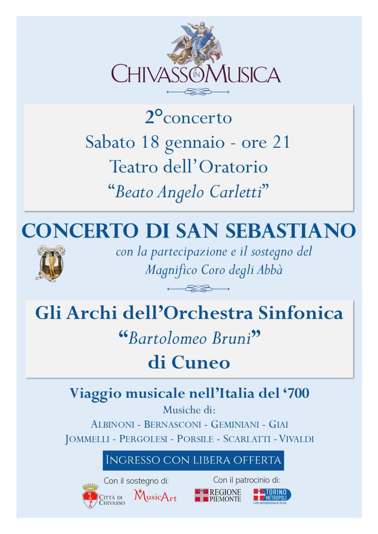 Con il sostegno della Città di Chivasso attraverso il Bando MusicArt 2025 e con il patrocinio della Città metropolitana di Torino, sabato 18 gennaio alle 21 al teatro dell’Oratorio Beato Angelo Carlettiè in programma ilsecondo appuntamento della stagione Chivasso in Musica 2025. Si tratta del Concerto di San Sebastiano, realizzato con la partecipazione e il sostegno del Magnifico Coro degli Abbà. Protagonisti della serata saranno gli Archi dell’Orchestra sinfonica Bartolomeo Bruni di Cuneo, che svilupperanno un programma intitolato “Viaggio musicale nell’Italia del ‘700”, che comprende composizioni di autori operarono nel corso del XVIII secolo a Venezia, Lucca, Milano, Napoli, Torino. La vivacità musicale settecentesca verrà evidenziata dalle note del compositore italiano più amato del periodo barocco: Antonio Vivaldi, di cui sarà eseguita l’Ouverture dall’opera “L’Incoronazione di Dario”, andata in scena per la prima volta al Teatro Sant’Angelo di Venezia nel 1717. A seguire un’altra pagina veneziana di Tomaso Albinoni, la Sinfonia in Sol minore per archi e basso continuo opera 2 numero 11. Si passerà, quindi, a Lucca con il Concerto grosso op.3 n. 1 in Re maggiore di Francesco Geminiani, per poi raggiungere Milano con Andrea Bernasconi, del quale sarà eseguita la Sinfonia in La maggiore. Napoli che si potrà scoprire attraverso quattro compositori: Nicolò Jommelli con la Sinfonia numero 3 in Re Maggiore, Giovanni Battista Pergolesi con la Sinfonia in Sol maggiore, Giuseppe Scarlatti con la Sinfonia in Fa maggiore e Giuseppe Porsile con la Sinfonia numero 2 in Re maggiore. La musica barocca di Torino verrà ricordata con la Sinfonia in Do maggiore di Giovanni Antonio Giai, mentre la conclusione sarà ancora una volta affidata ad Antonio Vivaldi con il Concerto per archi in Fa maggiore.