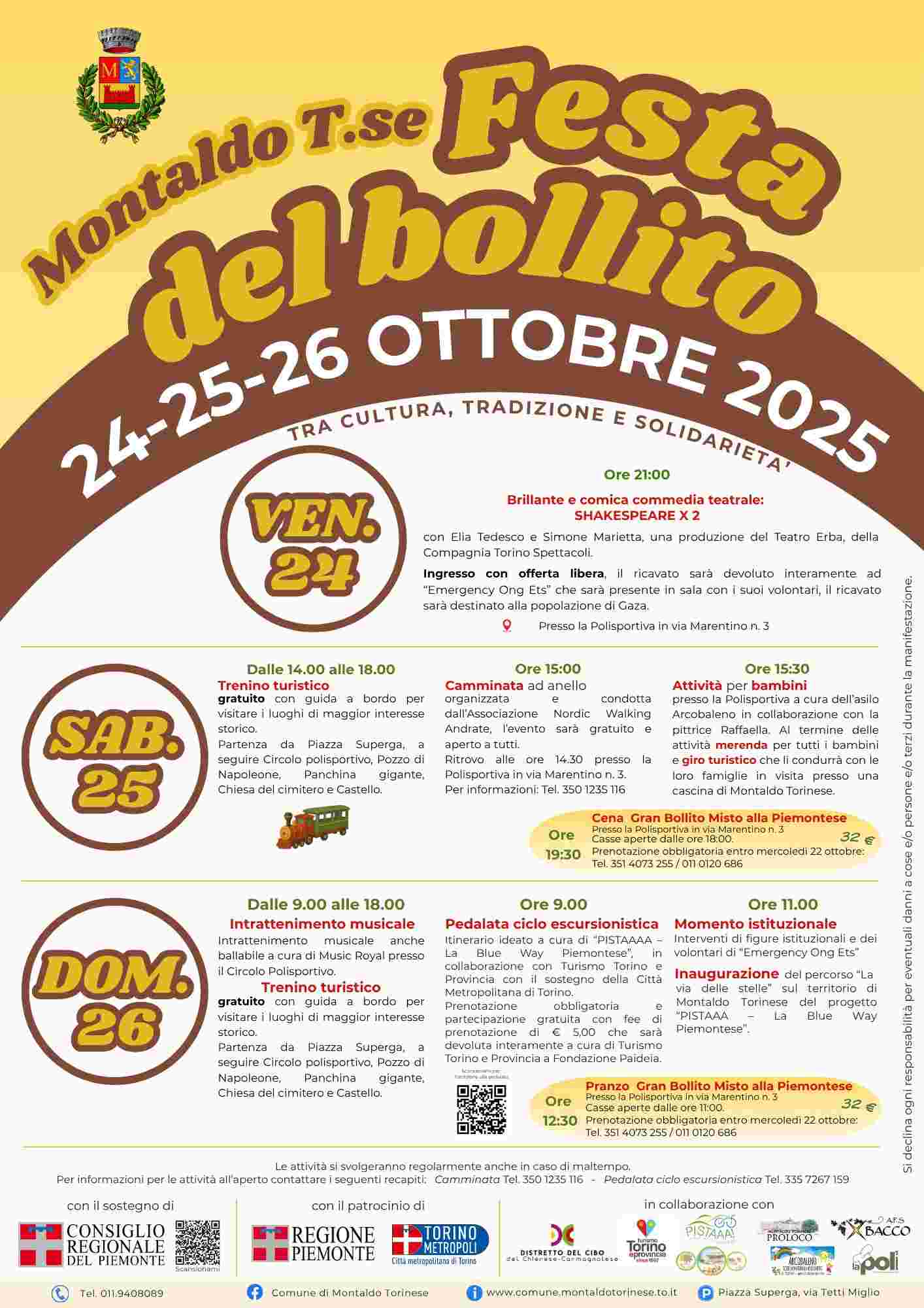 A Montaldo Torinese fervono i preparativi per la Festa del Bollito, in programma da venerdì 24 a domenica 26 ottobre con il patrocinio e il sostegno della Città metropolitana di Torino. Venerdì 24 nella sede della Polisportiva di via Marentino 3 andrà in scena la commedia “Shakespeare x 2” con Elia Tedesco e Simone Marietta, una produzione del Teatro Erba proposta dalla Compagnia Torino Spettacoli. L’ingresso sarà con offerta libera e il ricavato sarà devoluto interamente ad Emergency Ong Ets, che sarà presente in sala con i suoi volontari. Sabato 25 ottobre alle 9,30 il nuovo campo di calcio a 5 sarà inaugurato con un torneo quadrangolare per persone con disabilità, organizzato dall’associazione V.I.T.A.