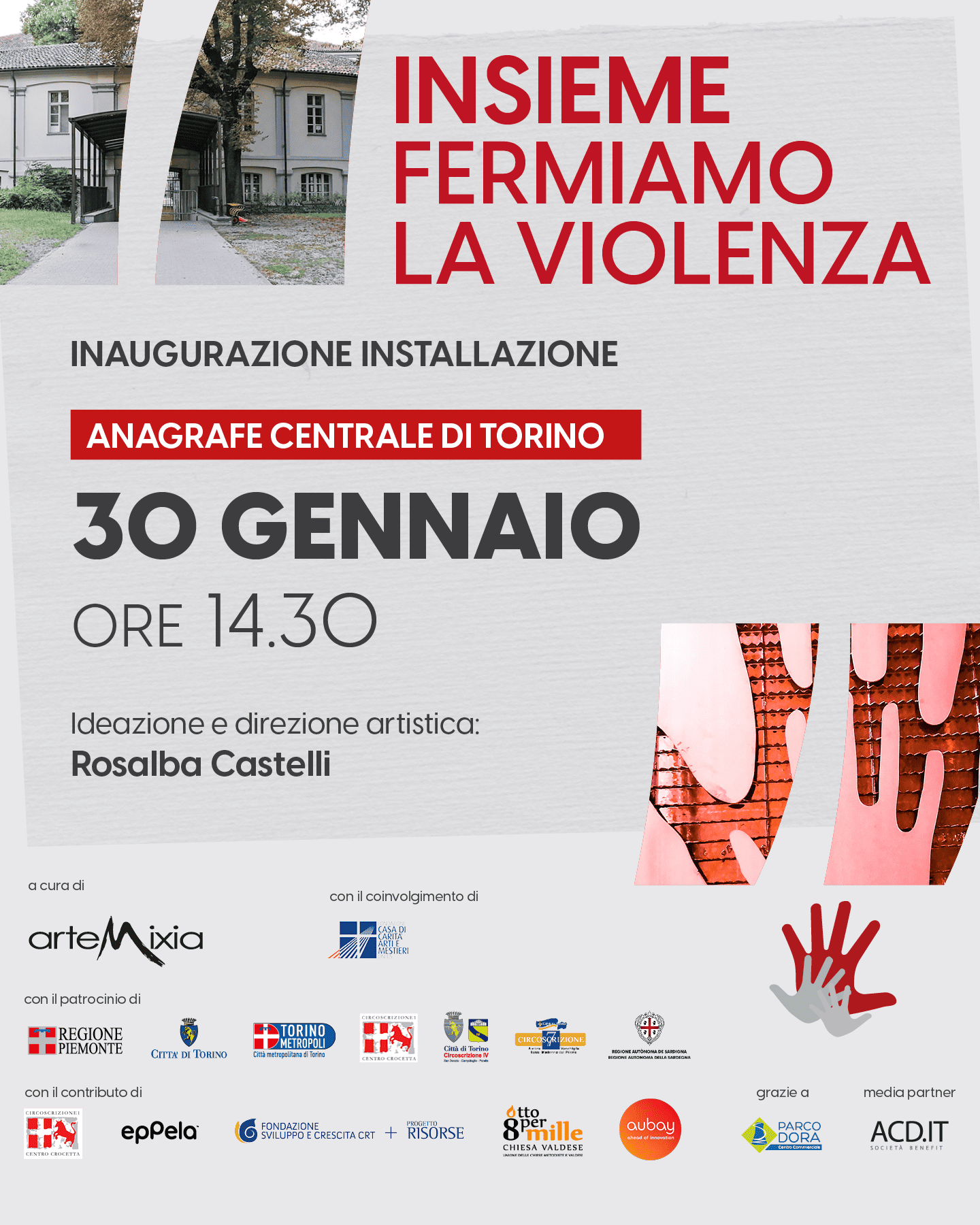 Venerdì 30 gennaio 2026, alle ore 14.30, all’Anagrafe Centrale di Torino (Via della Consolata 23), saranno inaugurate l’installazione "Insieme fermiamo la violenza" e, a seguire, la mostra "Rosso Indelebile - Sentieri antiviolenza", iniziative promosse da Artemixia APS ETS nell’ambito del progetto Rosso Indelebile.