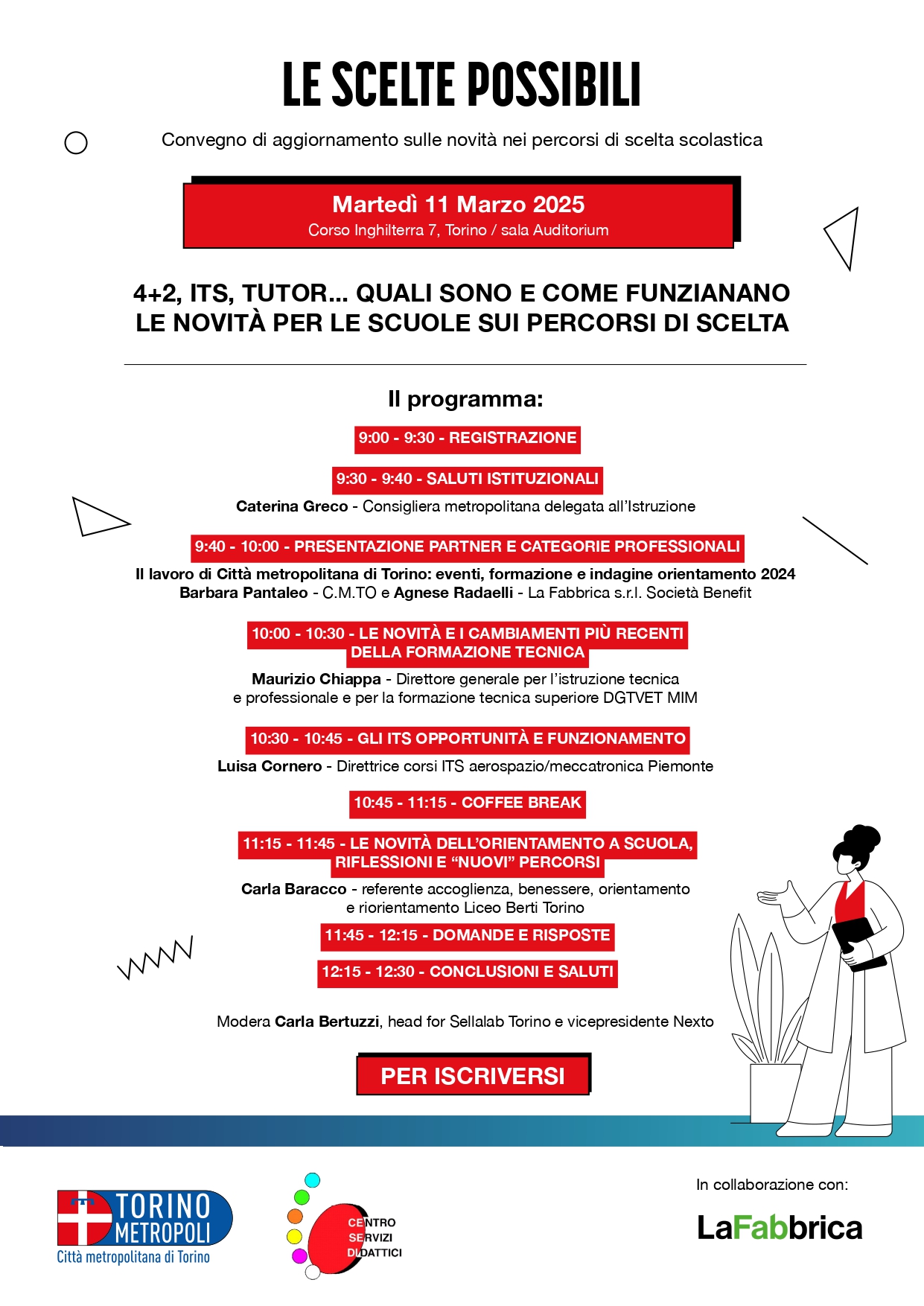 A partire dalla presentazione dei risultati del report annuale sulla didattica orientativa erogato a oltre 70 scuole nel 2024, si approfondiranno le nuove prospettive e opportunità formative emerse dalle recenti evoluzioni con Caterina Greco, consigliera metropolitana delegata all'Istruzione, Maurizio Chiappa, Direttore generale per l’istruzione tecnica e professionale e per la formazione tecnica superiore del Ministero, Luisa Cornero Direttrice corsi ITS aerospazio/meccatronica Piemonte, Carla Baracco, Referente accoglienza, benessere, orientamento e riorientamento del Liceo Berti Torino.