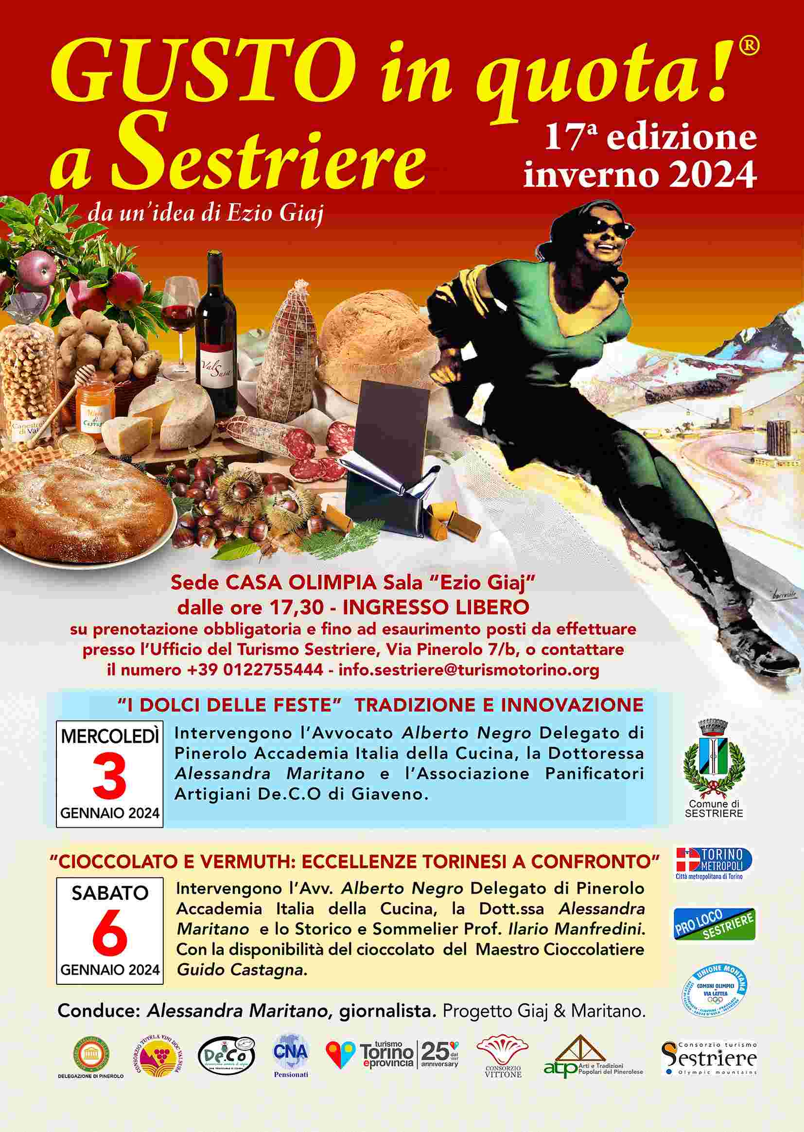 Nel nome dell’indimenticabile animatore culturale, il progetto viene portato avanti da Alessandra Maritano. Per le festività di fine anno sono stati programmati e organizzati, d'intesa con il Comune di Sestriere, due incontri. Mercoledì 3 gennaio si illustreranno e degusteranno i dolci delle feste, fra tradizione e innovazione. Interverranno Alberto Negro, delegato di Pinerolo dell’Accademia Italia della Cucina, l’associazione Panificatori De.C.O di Giaveno e Dario Calcagno Tunin dell’Associazione Regionale Panificatori. Sabato 6 gennaio i protagonisti saranno “Cioccolato e vermouth: eccellenze torinesi a confronto”, con Alberto Negro, Alessandra Maritano e lo storico e sommelier Ilario Manfredini. L’incontro sarà accompagnato dalle prelibatezze del maestro cioccolatiere Guido Castagna. Gli incontri si svolgeranno a Casa Olimpia, nella sala intitolata ad Ezio Giaj nello scorso mese di agosto per volontà del Sindaco di Sestriere, Gianni Poncet e dalla Consigliera comunale Emanuela Tedeschi, promotrice del programma Gusto in Quota. I due appuntamenti, con inizio alle 17,30, sono ad ingresso libero con prenotazione obbligatoria, da effettuare all’Ufficio del Turismo di via Pinerolo 7/b, chiamando il numero0122-755444 o scrivendo a info.sestriere@turismotorino.org