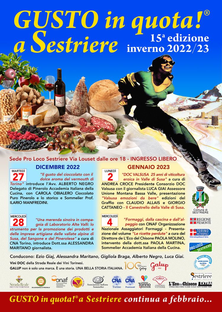 Nelle festività natalizie a Sestriere torna il tradizionale appuntamento con l’eccellenza enogastronomica: parliamo di “Gusto in Quota”, un evento consolidato giunto alla quindicesima edizione e organizzato da Comune, Consorzio Vittone, Unione Montana Via Lattea, Consorzio Turismo Sestriere, Accademia Italiana della Cucina, ONAF, AIS, Strada Reale dei Vini Torinesi e Turismo Torino e provincia, con il patrocinio e il sostegno della Città Metropolitana di Torino. Quattro gli appuntamenti pubblici, martedì 27 e mercoledì 28 dicembre, lunedì 2 e mercoledì 4 gennaio, per poi proseguire nel mese di febbraio e marzo. Gli incontri sono in programma nella sede della Pro Loco di Sestriere in via Louset alle 18 fino ad esaurimento posti e sono tutti ad ingresso libero con degustazione. Conducono le serate Ezio Giaj, Alessandra Maritano, Alberto Negro e Luca Giai.