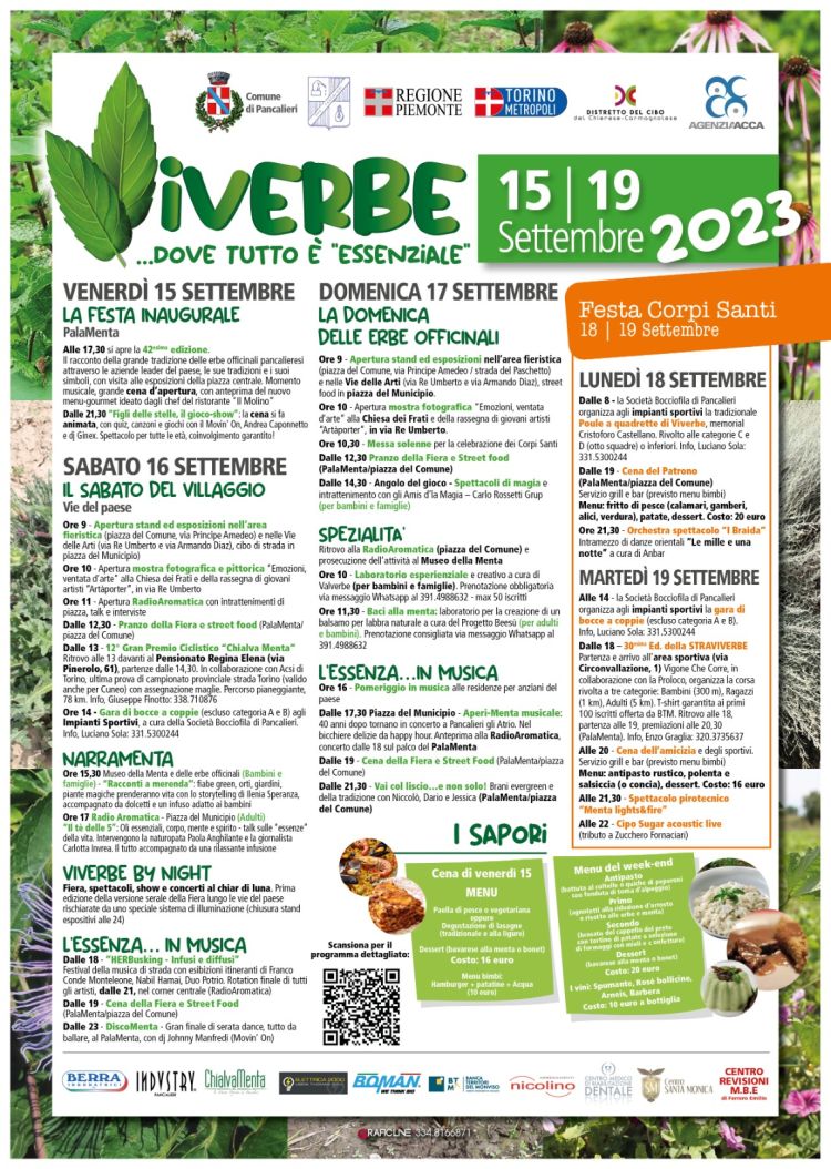 Grazie alla collaborazione tra Comune e Pro loco di Pancalieri e agenzia Acca, con il sostegno delle attività e delle associazioni del territorio, la rassegna Viverbe inizia un nuovo corso. Venerdì 15 settembre alle 17,30 al PalaMenta in piazza del Municipio autorità e pubblico sono chiamati a partecipare all’inaugurazione dell’evento, come sempre patrocinato dalla Città metropolitana di Torino, per visitare gli stand delle aziende legate alla tradizione della lavorazione della menta e delle erbe officinali e partecipare ad un tour guidato al Museo della Menta. A seguire, nella nuova area gastronomica allestita dal ristorante “Il Molino”, è in programma la cena animata “Figli delle stelle”. La “Viverbe by Night” permetterà di prolungare i tradizionali due giorni della fiera con oltre 90 espositori anche nelle ore serali del sabato, fino alle 24. Il festival busker “Infusi e diffusi” sabato 16 settembre animerà le vie del centro con spettacoli musicali realizzati da ragazzi provenienti da tutto il mondo. Le inedite rassegne “Spezialità” e “Narramenta” sono state pensate per impreziosire il weekend con iniziative per adulti e bambini. La Via delle Arti prenderà vita grazie a una trentina di artisti e artigiani. Tra le novità figurano anche gli intrattenimenti e l’area food “Made in Pancalieri”. La Radio Aromatica sarà il quartier generale della Fiera, con approfondimenti, interviste e show. Le nuove aree pERBAcco! e PalaMenta in piazza del Comune proporranno menù ogni giorno diversi, fast-food e bevande.