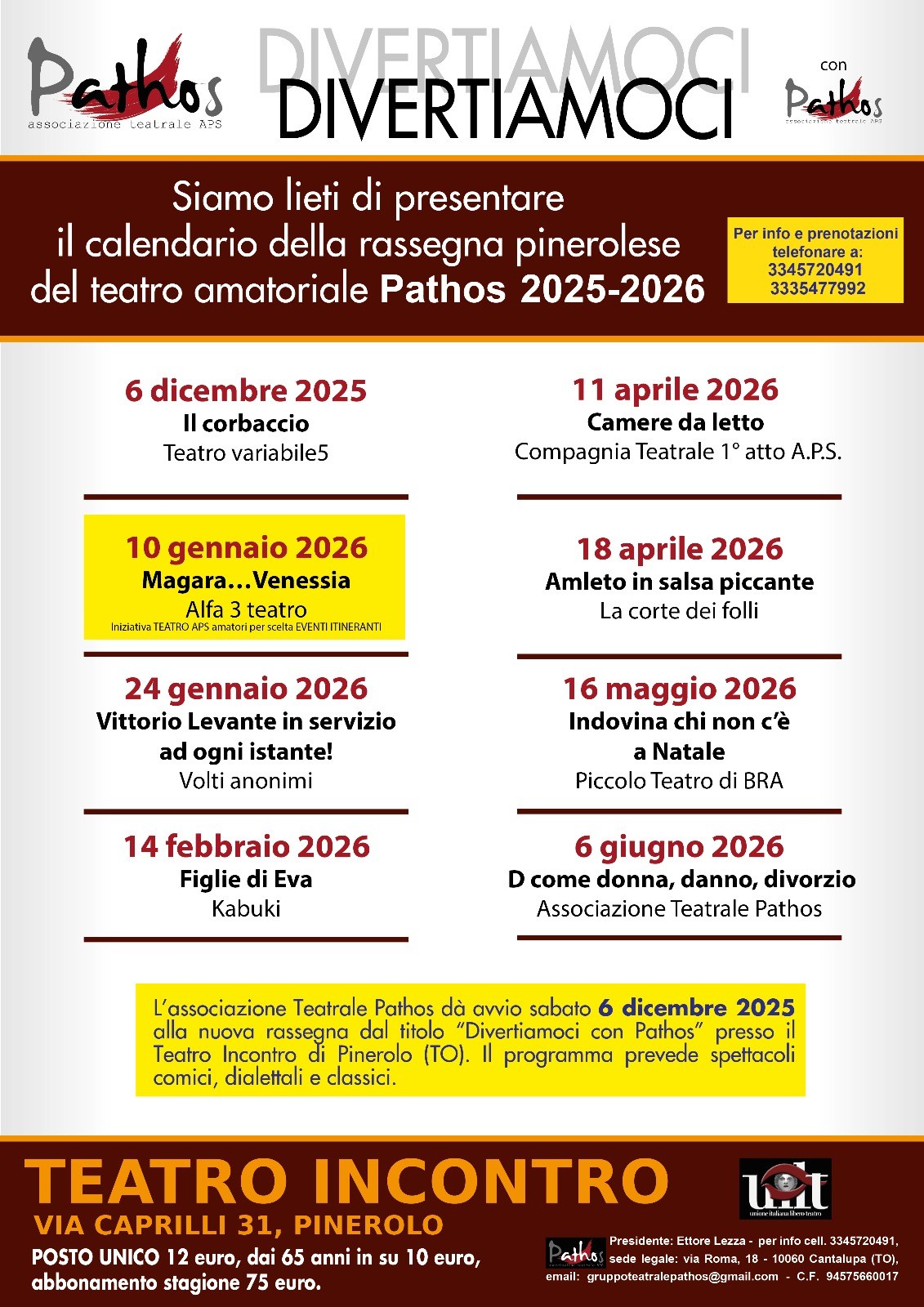 Prende il via sabato 6 dicembre per concludersi a giugno 2026, la nuova rassegna teatrale amatoriale intitolata “Divertiamoci con Pathos”. Un cartellone ricco e vario che offrirà al pubblico otto appuntamenti al Teatro Incontro di Pinerolo, bilanciando temi di riflessione con l’intrattenimento leggero, grazie a sei commedie comiche.
