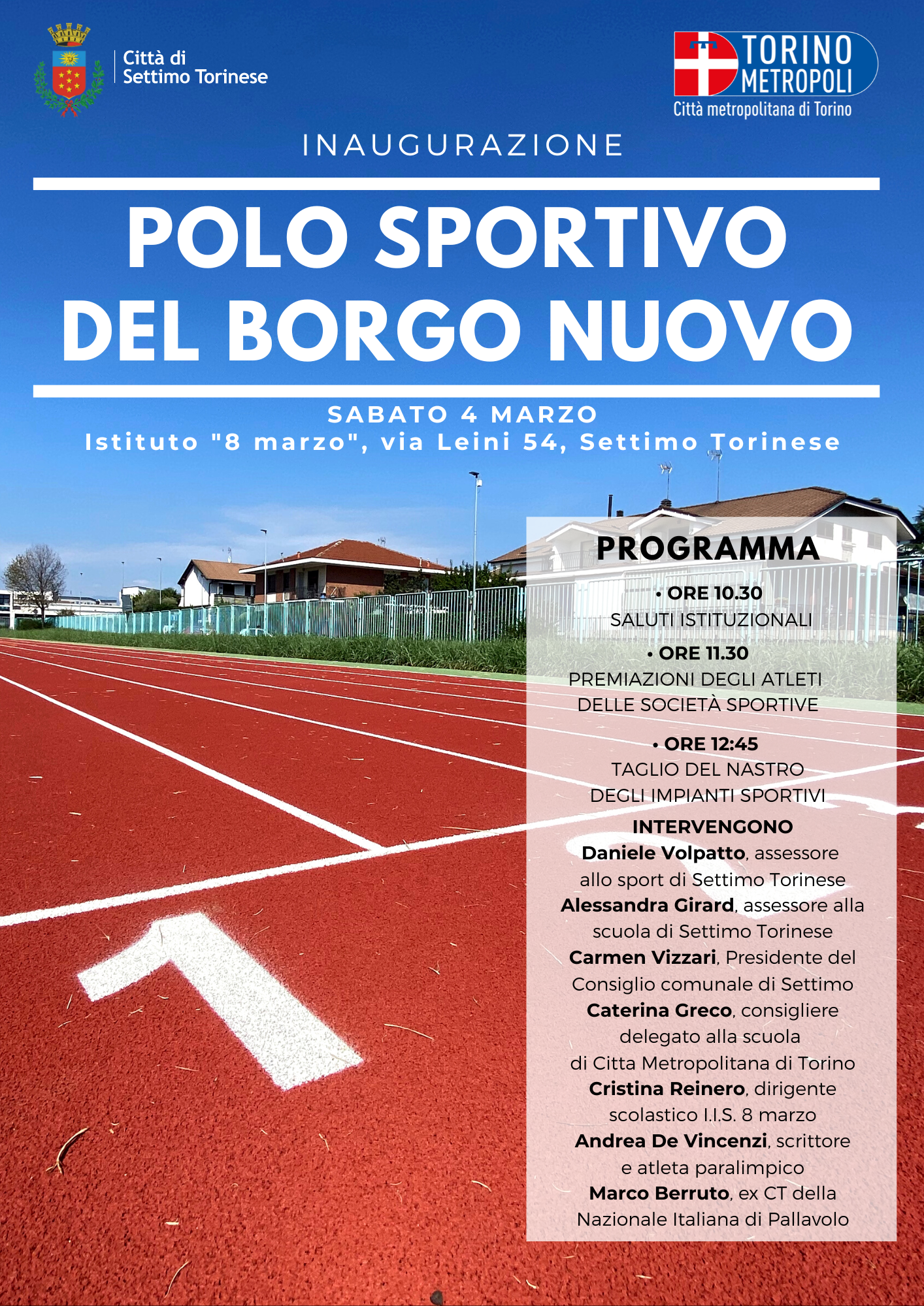Terminata la ristrutturazione, è tempo di una nuova inaugurazione per il centro sportivo del Borgo Nuovo di Settimo Torinese, ospitato nell'area esterna dell’Istituto 8 Marzo di via Leinì 54, su di un terreno proprietà della Città metropolitana di Torino. La cerimonia è in programma sabato 4 marzo alle 10,30 e inizierà con i saluti istituzionali delle autorità locali e metropolitane, a cui seguirà la premiazione degli atleti e delle società sportive di eccellenza della Città di Settimo Torinese. La Città metropolitana di Torino sarà rappresentata dalla Consigliera Caterina Greco, delegata al Bilancio, all’istruzione, al sistema educativo e alla rete scolastica e cittadina settimese.