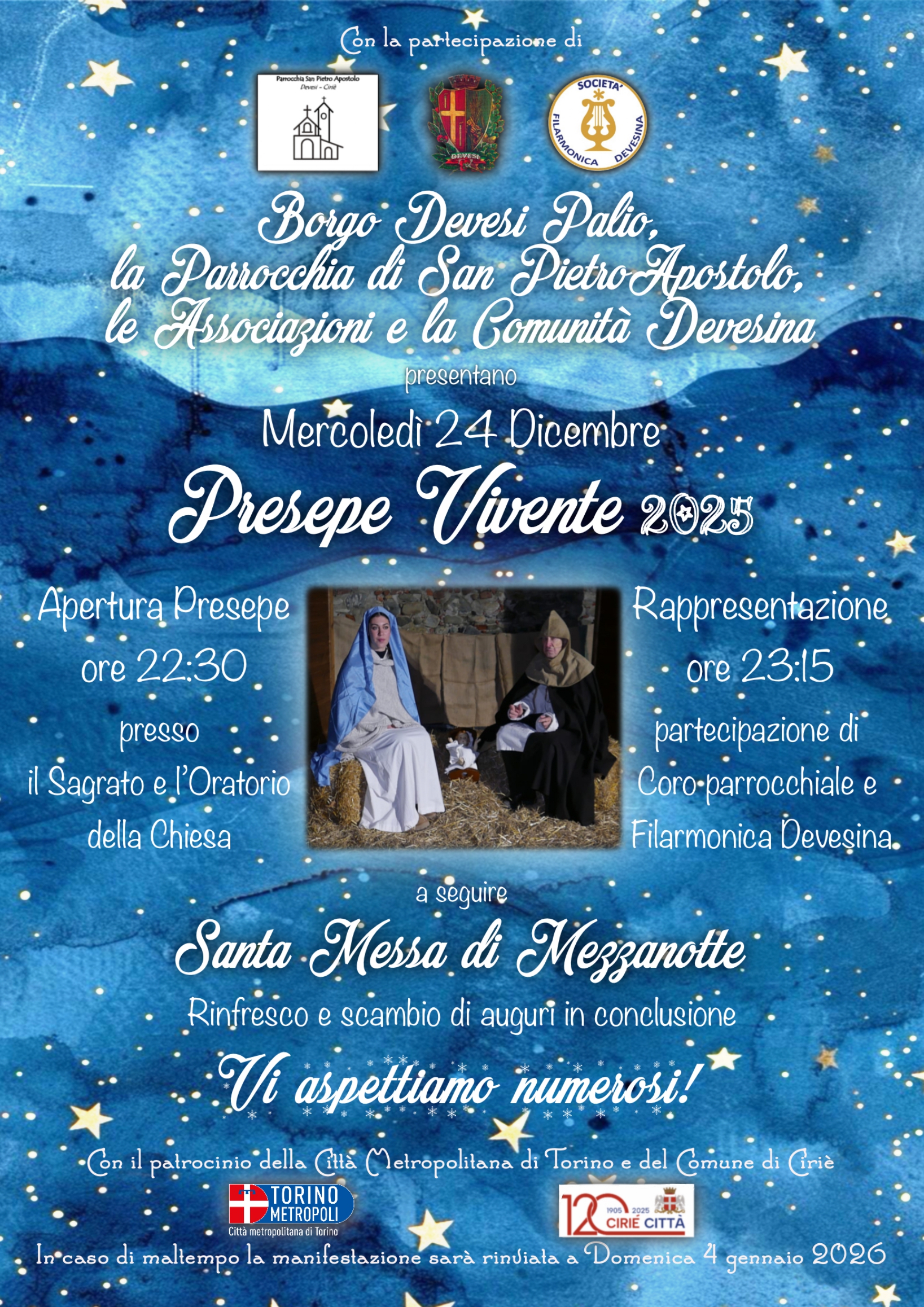 Nella suggestiva cornice del Borgo Devesi Palio della Città di Ciriè, la notte della vigilia di Natale si accende di spiritualità e folklore grazie alla rappresentazione del Presepe Vivente. L'evento, patrocinato dalla Città di Cirié e dalla Città metropolitana di Torino, prenderà vita mercoledì 24 dicembre in parte sul sagrato antistante la chiesa di San Pietro Apostolo di Devesi e in parte all’interno del cortile dell’oratorio dalle 22.30 alle 24.
