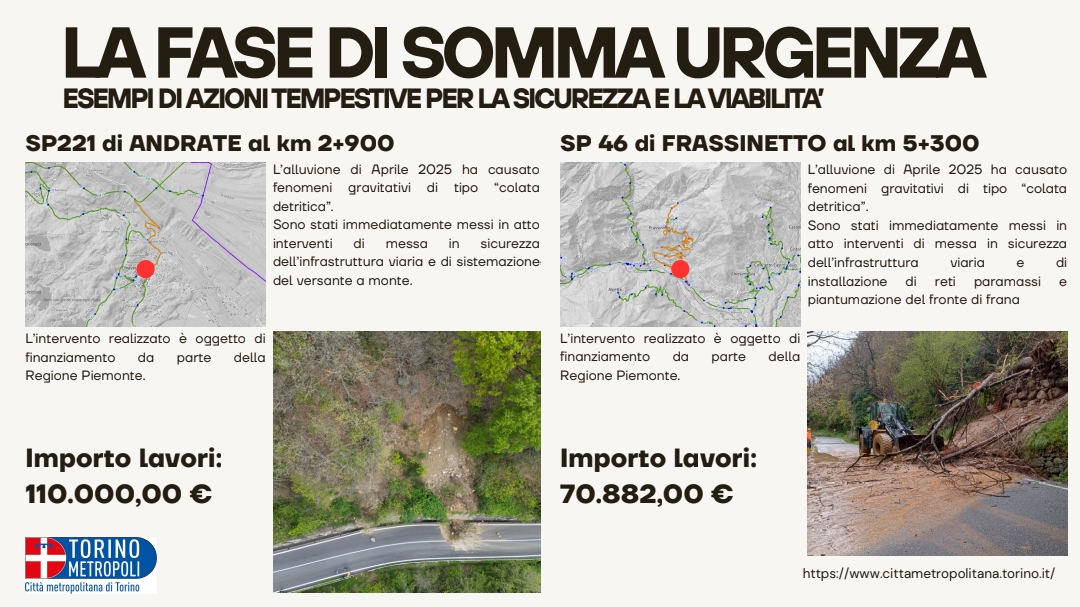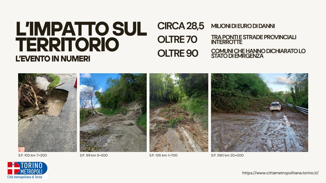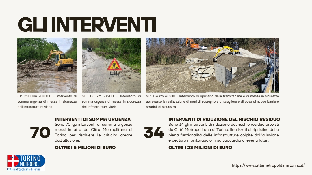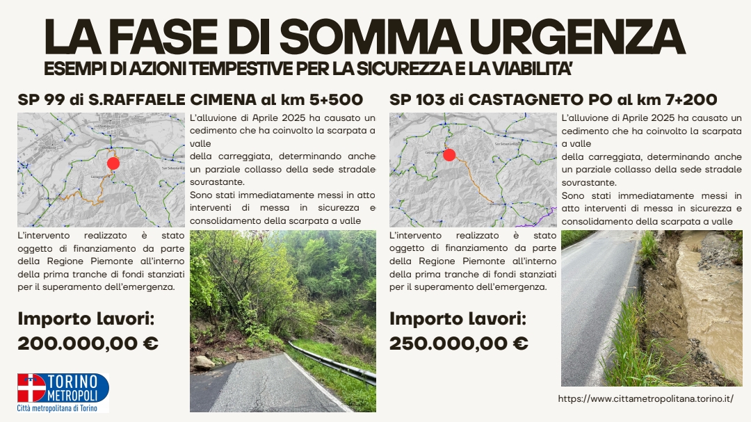 Valutate l’entità dei danni e le priorità, all’inizio di maggio 2025 La Città metropolitana di Torino stanziò oltre 5 milioni di euro solo per finanziare 70 interventi di somma urgenza. Le somme necessarie vennero quasi completamente coperte da uno stanziamento di 4 milioni e 986.000 euro previsto da una variazione di bilancio.