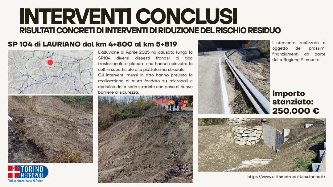 - sulla Provinciale 104 di Lauriano tra il km 4+800 e il km 5+819 si sono verificate diverse frane di traslazionali e planari, che hanno coinvolto la coltre superficiale e la piattaforma stradale. Gli interventi, che riceveranno un finanziamento regionale di 250.000 euro, hanno previsto la realizzazione di un muro fondato su micropali e il ripristino della sede stradale con la posa di nuove barriere di sicurezza.