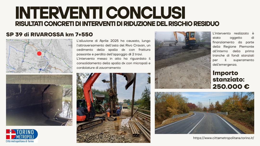 - sulla Provinciale 39 di Rivarossa al km 7+550 l’alluvione dell’aprile 2025 ha causato, lungo l’attraversamento dell’asta del Rivo Cravan, un cedimento della spalla destra con frattura passante e perdita dell’appoggio di 2 travi. È stato effettuato il consolidamento della spalla dx con micropali e cordolature di zavorramento. L’intervento è stato finanziato con 250.000 euro dalla Regione Piemonte nella prima tranche dei fondi per il superamento dell’emergenza