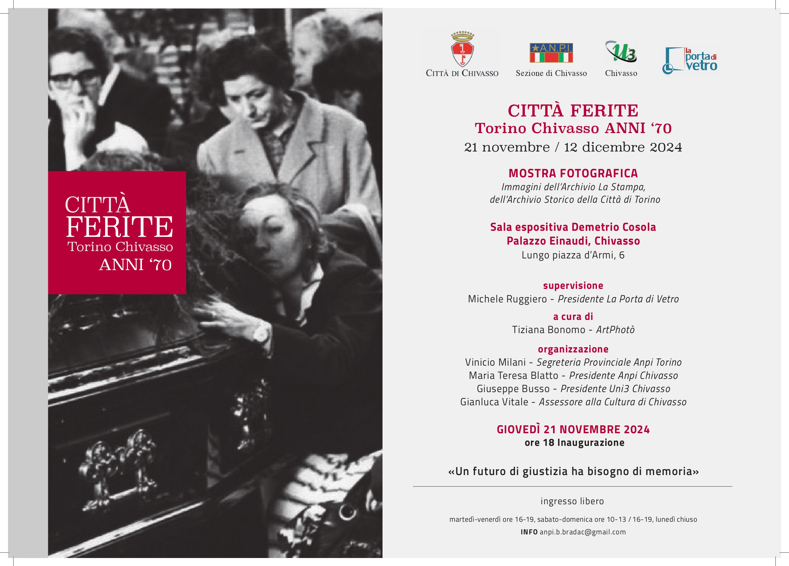 Dal 22 novembre al 12 dicembre 2024 Palazzo Einaudi di Chivasso ospita la mostra storico culturale “Città ferite. Torino-Chivasso anni ‘70”, ideata dall’Associazione La Porta di Vetro e curata da Michele Ruggiero, presidente e socio fondatore dell’Associazione, e Tiziana Bonomo di ArtPhotò, in collaborazione con ANPI, Unitre e amministrazione comunale di Chivasso.