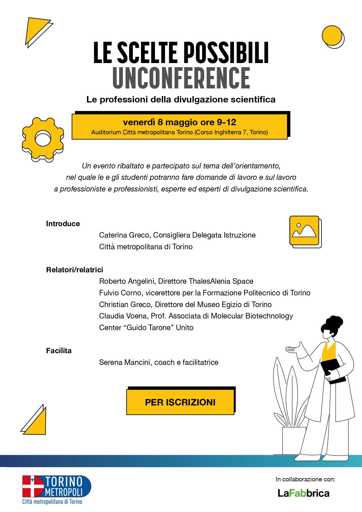 che offre un’occasione unica di orientamento per ragazze e ragazzi delle classi IV e V delle scuole secondarie di secondo grado. L’evento si terrà l'8 maggio dalle 9:00 alle 12:00 presso l’Auditorium della Città metropolitana di Torino.