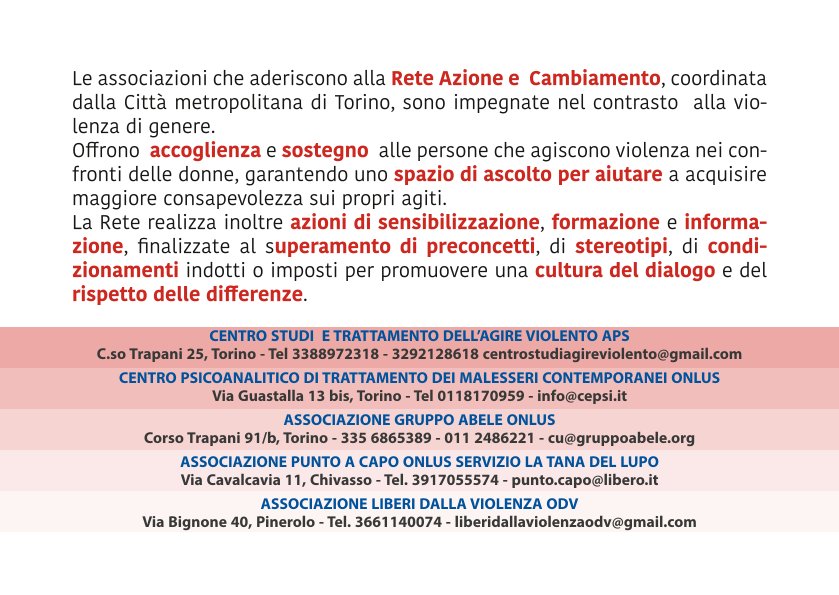 - creare un gruppo di confronto permanente per rappresentare una rete organica dei centri di ascolto e accoglienza degli autori di violenza di genere, presenti sul territorio metropolitano, coordinata dalla Città metropolitana di Torino;