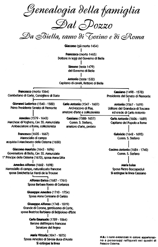 La Famiglia Dal Pozzo della Cisterna è di antichissime origini, suddivisa in vari rami che presero sede in diversi luoghi d'Italia. Il ramo più importante rimase però sempre quello di Biella che si estinse nel 1876 con la principessa Maria Vittoria che sposò Amedeo di Savoia Duca d'Aosta